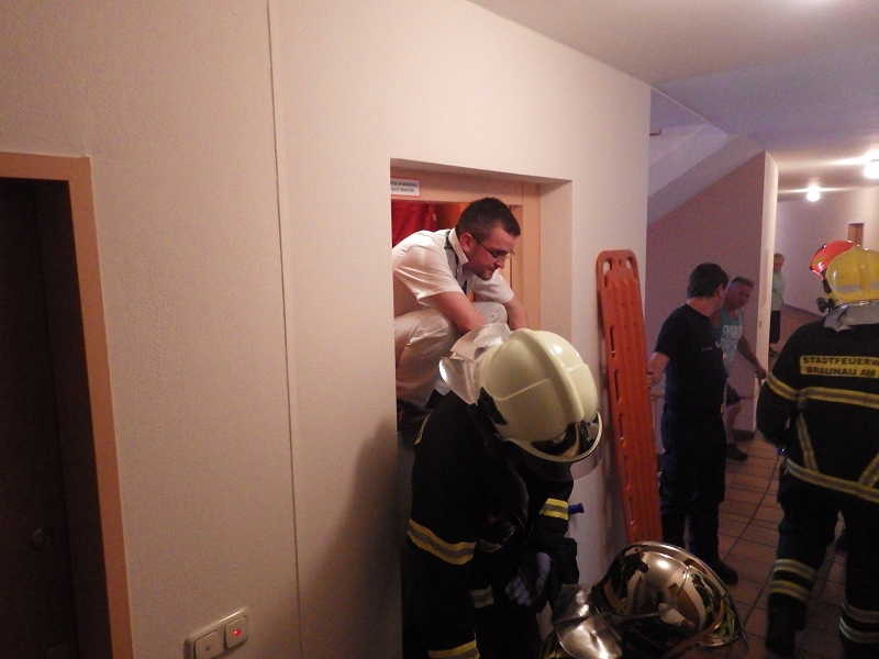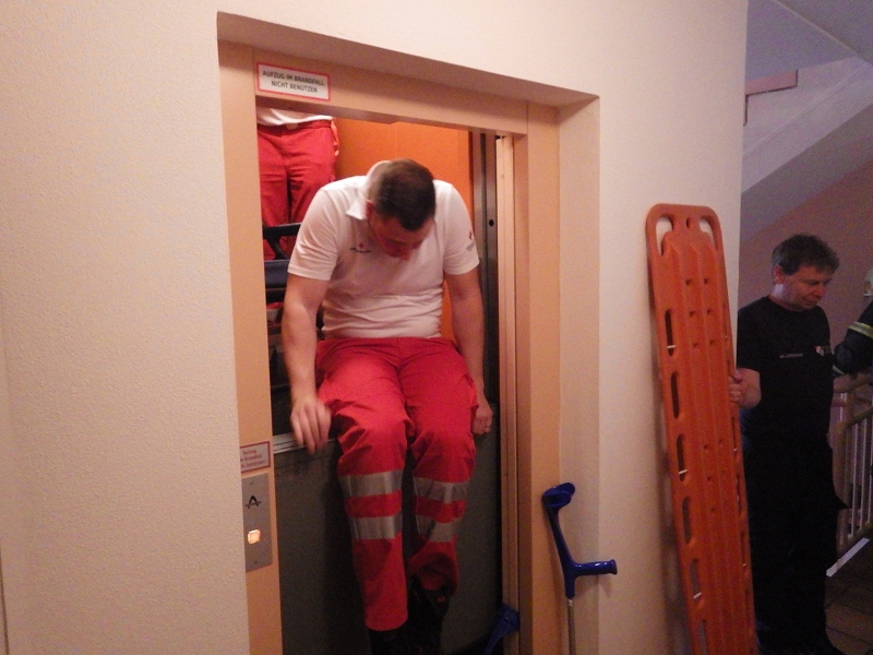 | Beschreibung: | Eine ungewöhnliche Alarmierung erreichte die FF Braunau: “ Personenrettung, Notarztteam mit Notfallpatienten in Lift eingeschlossen“. Die FF Braunau rückte mit KDO-F1, VRF, TLF 2 und der Drehleiter zum Einsatzobjekt aus. Nachdem der stecken gebliebene Aufzug außer Betrieb gesetzt wurde konnte die Lifttüre geöffnet werden. Da es sich um einen medizinischen Notfall handelte wurde sofort mit der Personenrettung begonnen. Auf das Ablassen des Fahrkorbes wurde aus Zeitgründen verzichtet. Nach 34 Minuten konnte die FF Braunau wieder einrücken. |