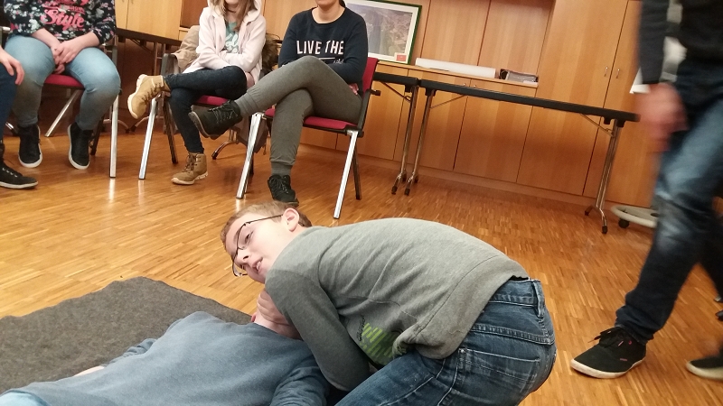 Die Jugendlichen erlernten hierbei das Anlegen von verschiedensten Verbänden sowie das richtige Vorgehen bei bewusstlosen Personen und das Reanimieren. Zuletzt wurde auch noch das Retten von Personen aus einem Fahrzeug mittels Rautekgriff geübt.