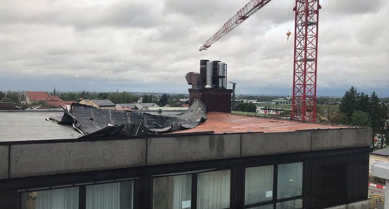 Los ging es mit einem Brandmeldealarm im Krankenhaus Braunau, bei der Erkundung wurde festgestellt, dass Teile des Dachs abgedeckt waren. Wasser drang bereits in die darunter liegende Bettenstation ein. Die Station wurde durch das Krankenhauspersonal evakuiert, die FF Braunau deckte das Dach mit Planen provisorisch zu.