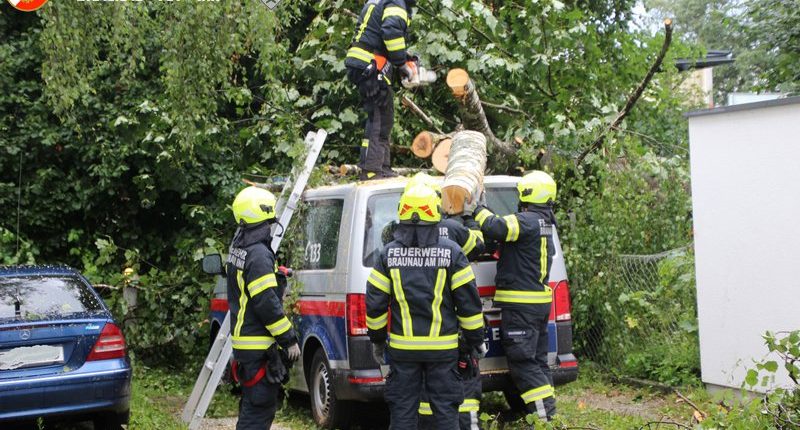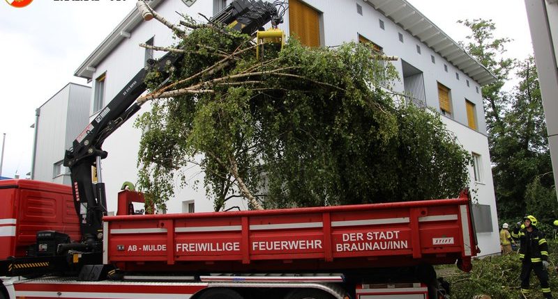 Seit 07:00 Uhr ist die FF Braunau mit rund 40 Einsatzkräfte wieder im Einsatz um Sturmschäden zu beseitigen. Unterstützt werden wir dabei von der Feuerwehr Ried i. I. mit dem Kranfahrzeug sowie der FF Mattighofen mit dem Hubsteiger und die Feuerwehr Simbach mit der Drehleiter.