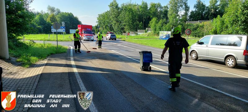 | Beschreibung: | Wegen eines technischen Defekts verlor ein PKW eine große Menge Dieselkraftstoff. Die Ölspur zog sich von der Abfahrt B148 „Braunau Zentrum“ bis zur Kreuzung Industriezeile/Gasteigerstraße. Die FF Braunau streute die Ölspur mit Bindemittel ab und reinigte anschließend die Fahrbahn. |