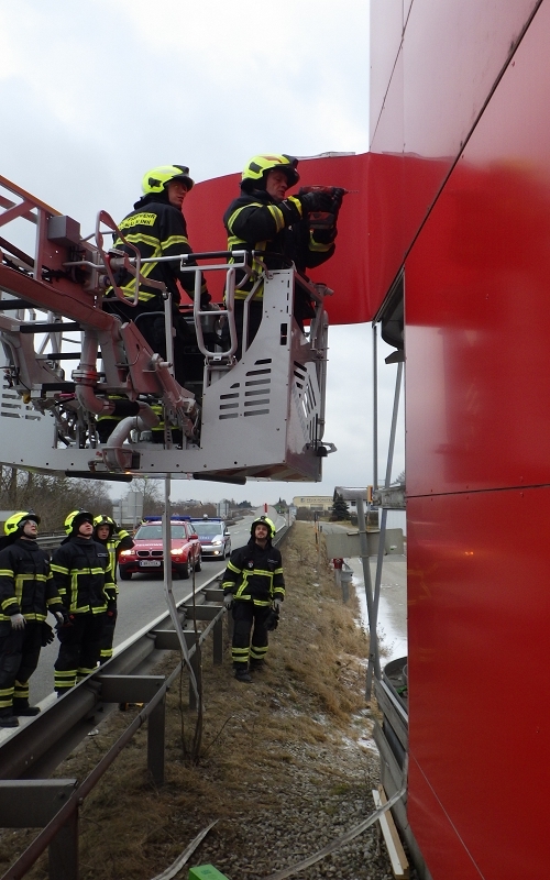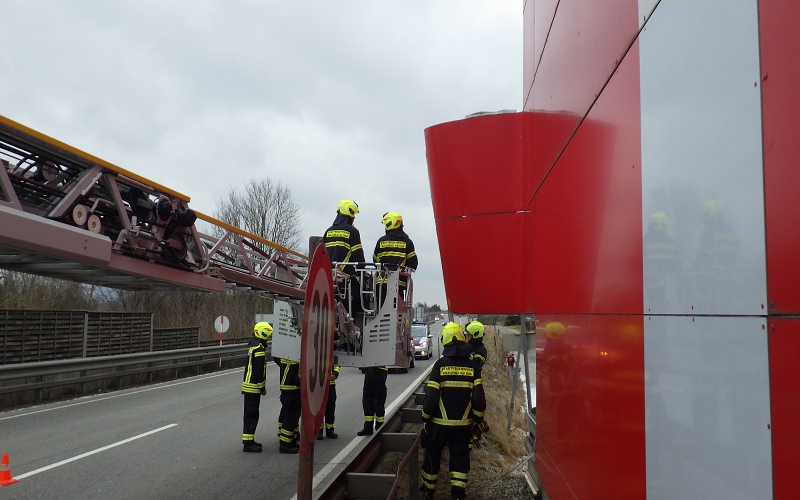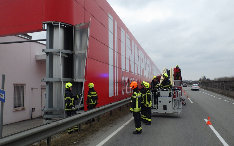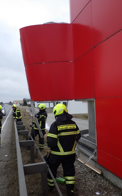 | Beschreibung: | Bei einem Einkaufszentrum in Braunau lösten sich durch den Wind Fassadenteile und drohten auf die vorbeiführende B148 zu stürzen. Die FF Braunau entfernte 3 lose Blechpaneele und sicherte sie am Boden. |