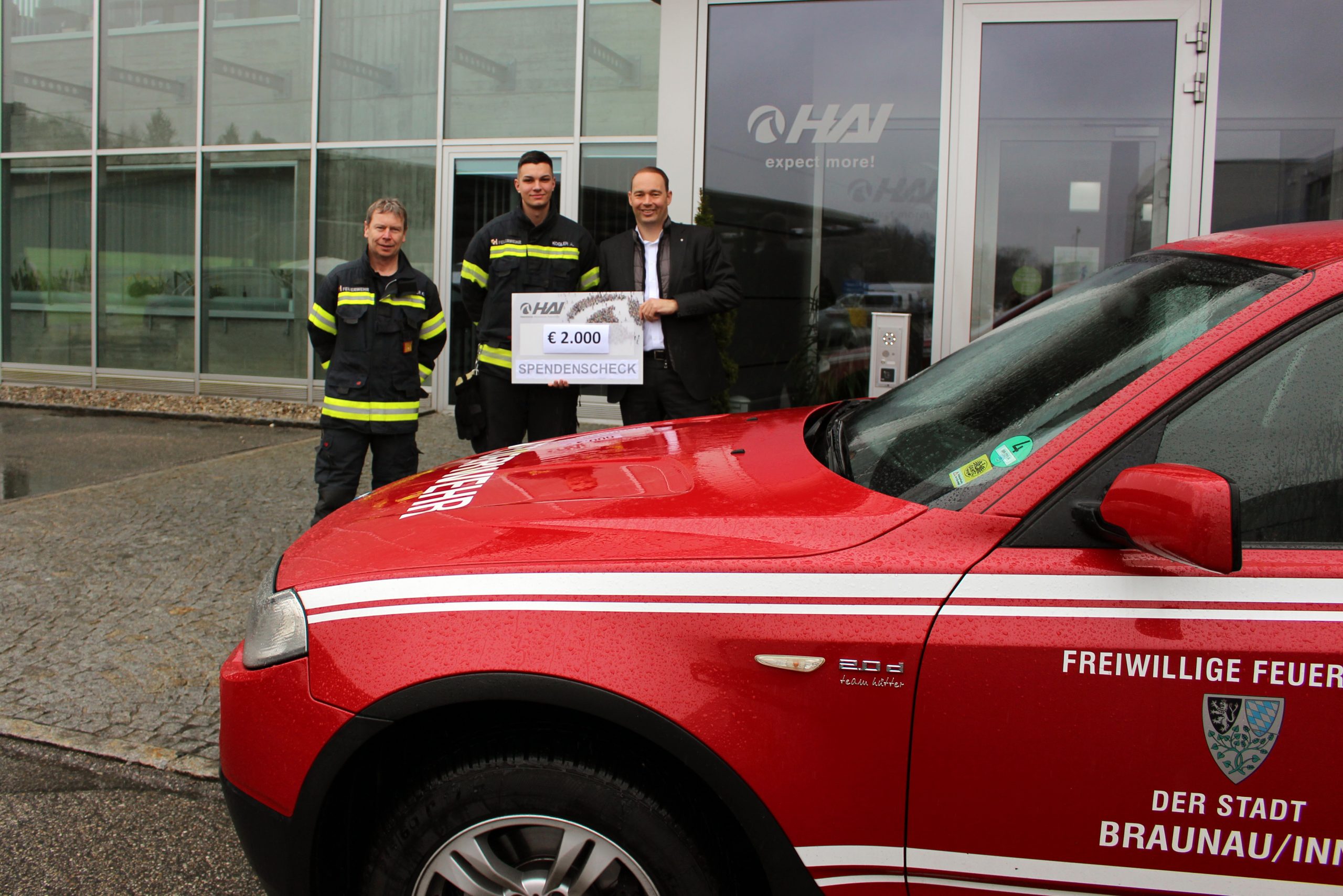 Bild (v.l.n.r.: Klaus Litzlbauer, Kommandant der Feuerwehr Braunau; Alexander Kogler, Mitarbeiter der Firma HAI & Mitglied der Feuerwehr Braunau; DI Rob van Gils, CEO der HAI-Gruppe)