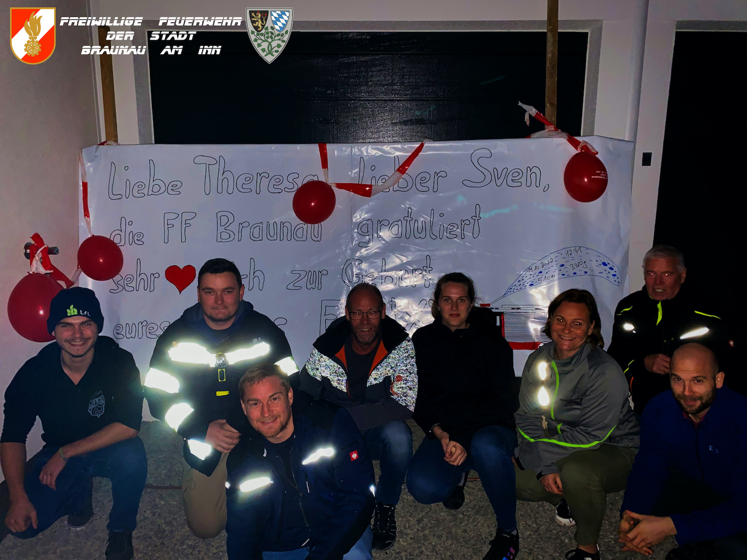 Eine kleine Abordnung der Feuerwehr Braunau schmückte das Zuhause der Familie mit Storch und Transparent.